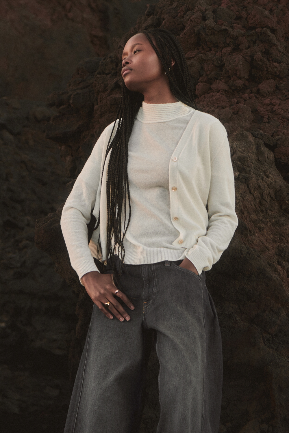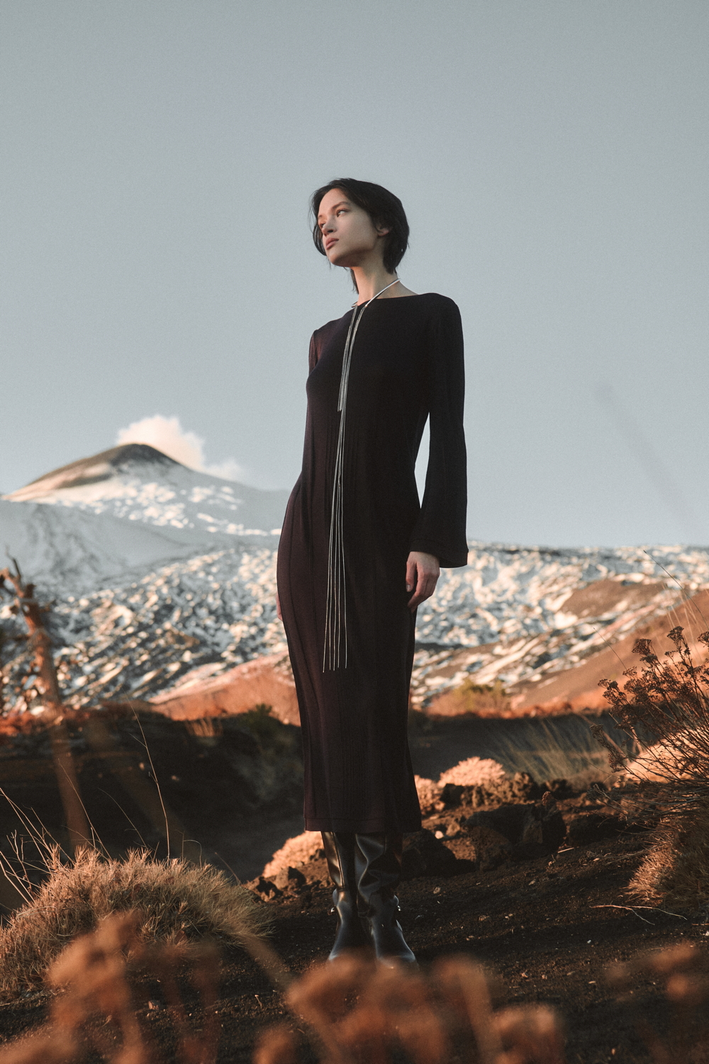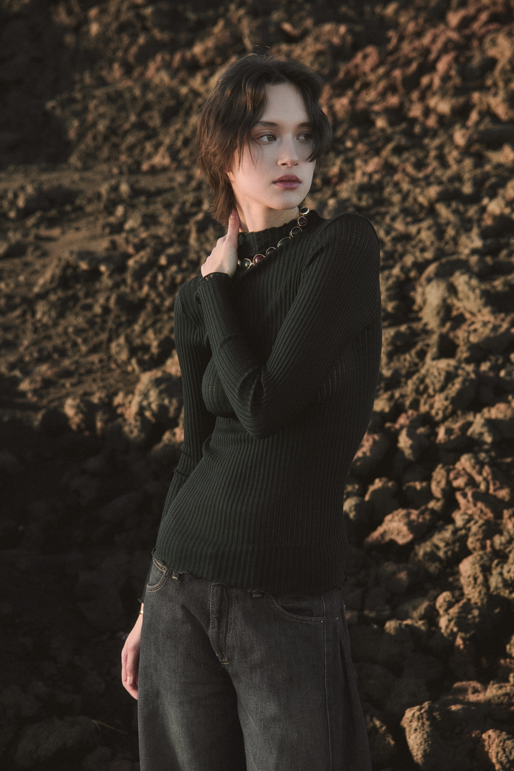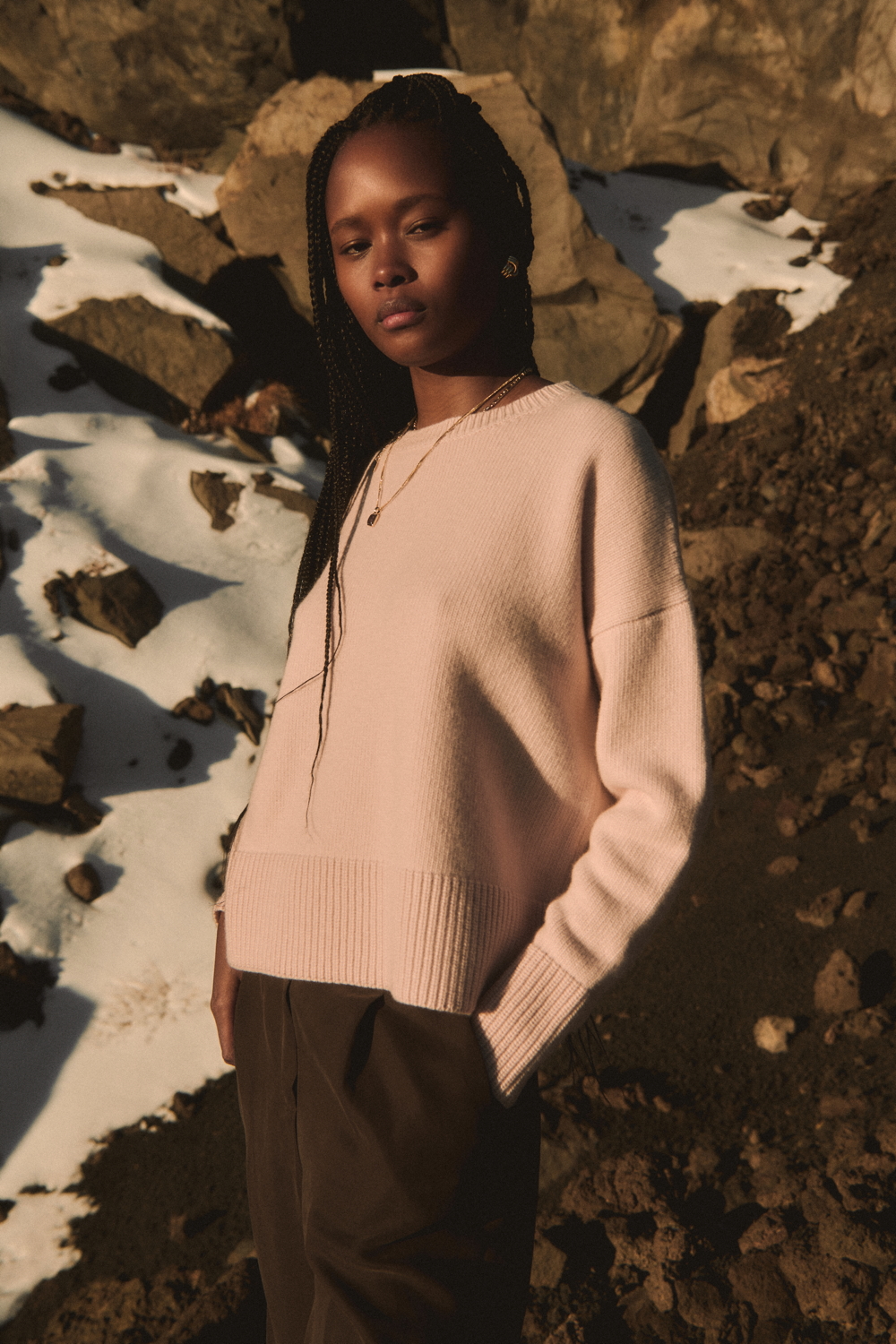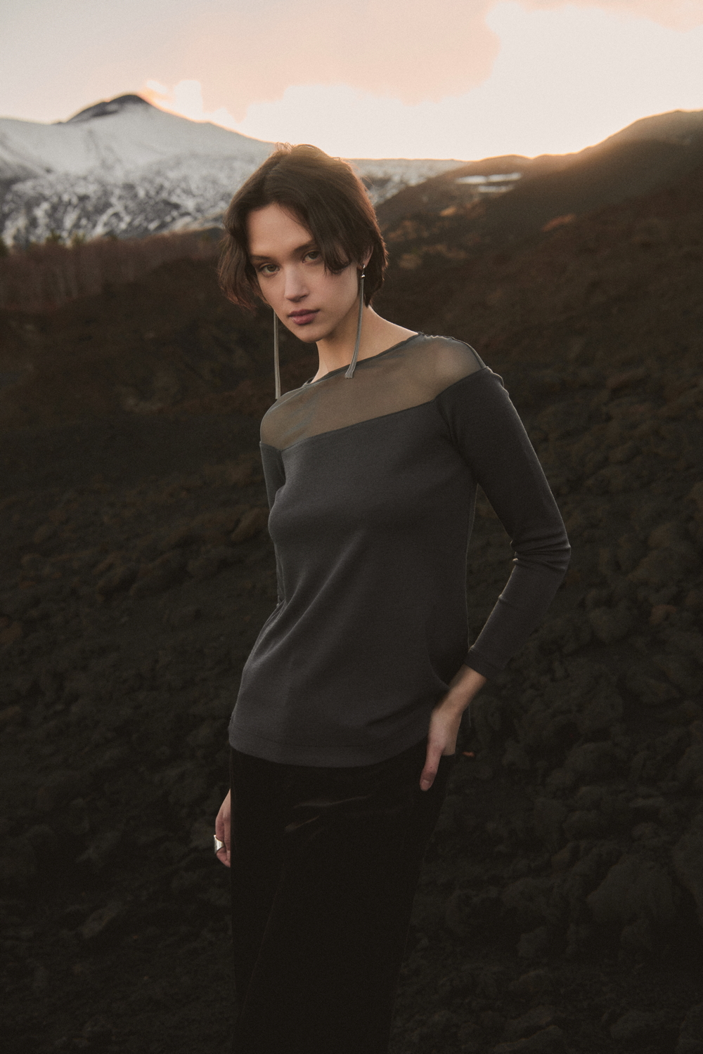 Essential cotton ribbed must-haves, such as tank tops and under-jackets, sit alongside wool and silk operatino fabrics with a subtle see-through texture, interpreting lightness with understated elegance. The offer is completed by a rich selection of fully fashioned knitwear made from natural fibres — alpaca, pure wool and wool cashmere — resulting in sweaters and cardigans with a wide range of nuances, from light and airy textures to more enveloping structures.
