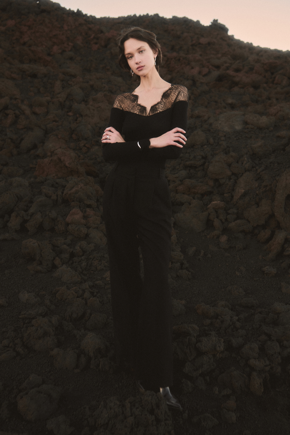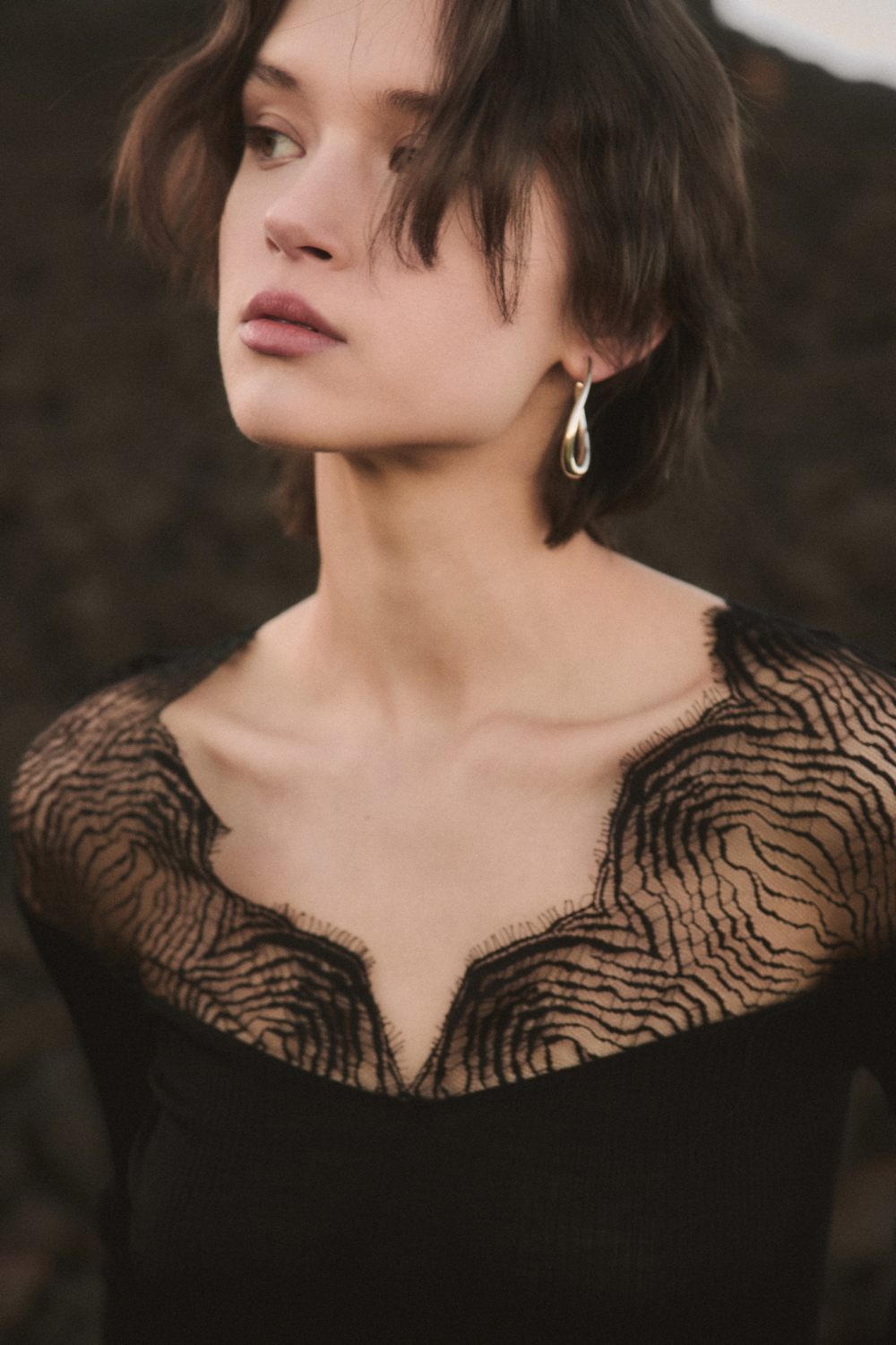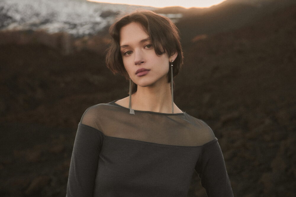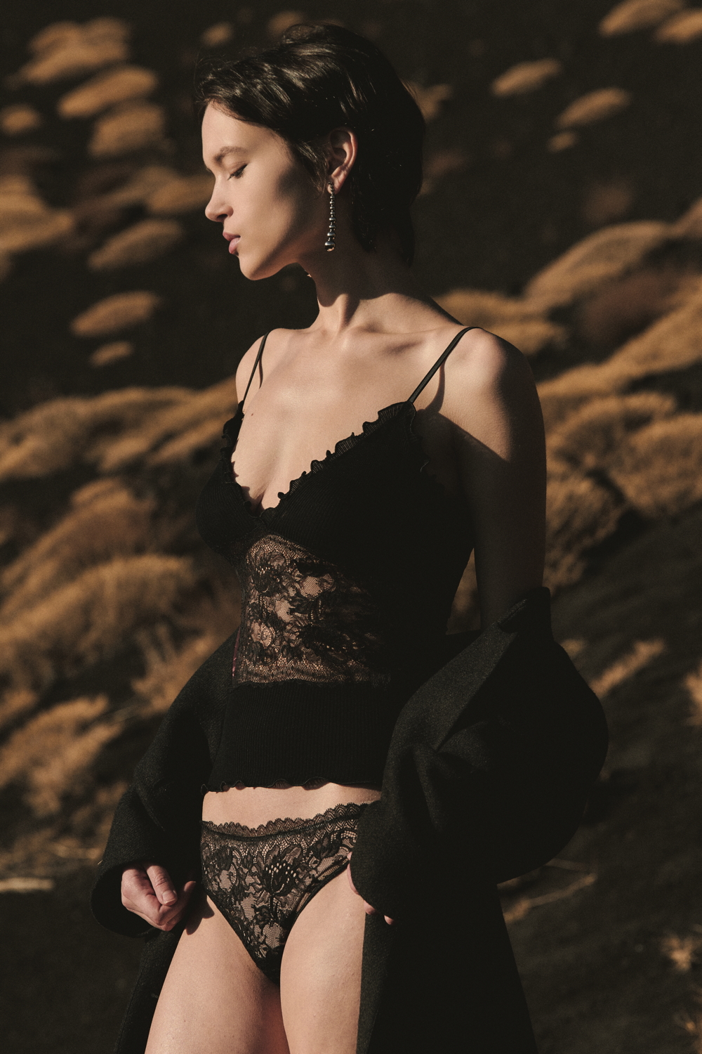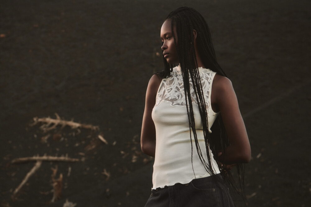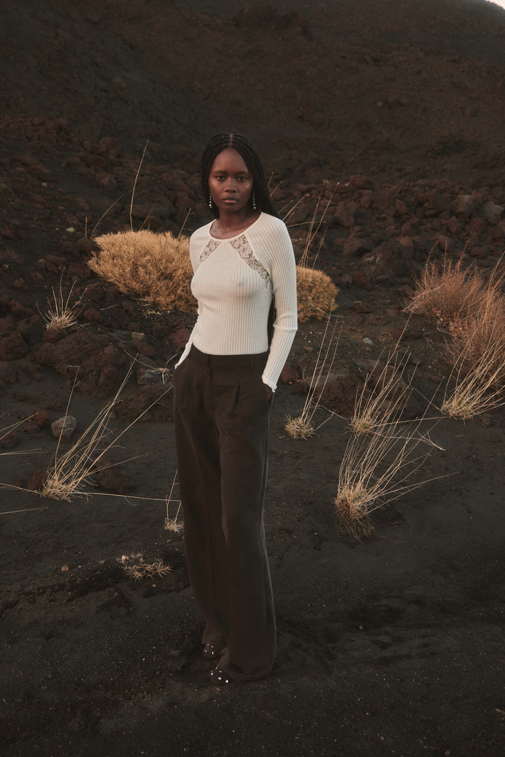A true expression of the brand’s historical DNA, the ICONIC line continues to celebrate refined femininity through the excellence of lace and precious craftsmanship, reinterpreted with a contemporary eye. At its heart lies Leavers lace with a floral motif, used for both elegant under- jackets and sensual lingerie sets, crafted reproducing iconic styles drawn from Oscalito’s vintage archive, reaffirming the value of memory as a source of creative inspiration. Alongside Leavers lace, Chantilly lace stands out with a new pattern of sinuous, concentric lines inspired by natural textures. In its more traditional interpretation, it is also presented as a refined lace trim, enhancing under-jackets and lingerie sets, as well as in a floral lace laize that gives shape to dresses and knitwear with a more contemporary, casual design. Sophisticated details such as the geometric macramé insert, creating an elegant collar-like effect on knitwear, and the cutwork flounce with ramage embroidery on tulle, further enrich the collection.