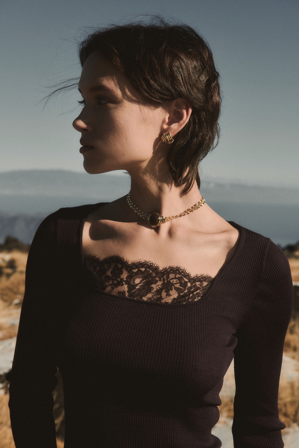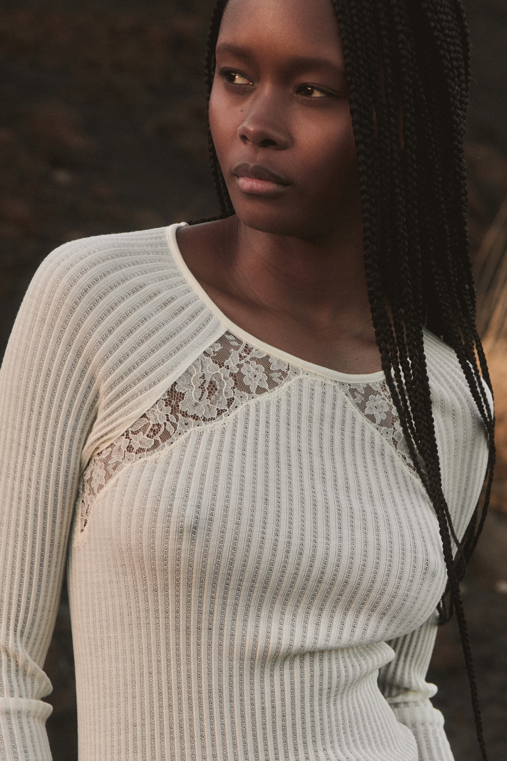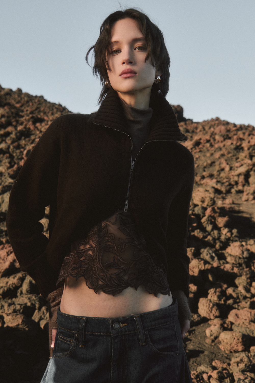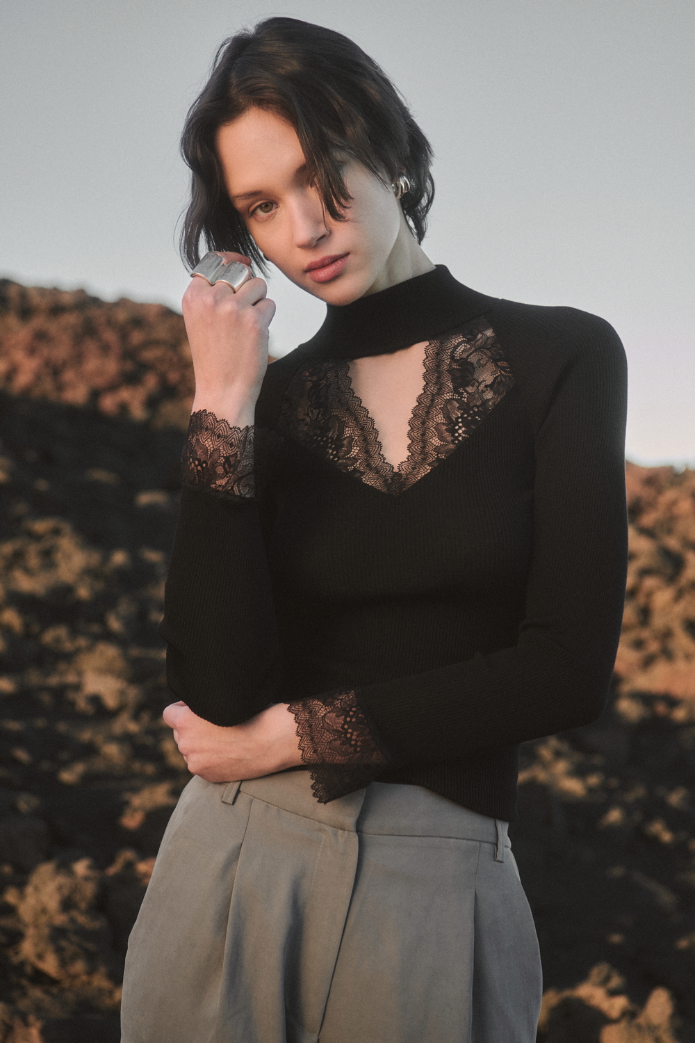 A true expression of the brand’s historical DNA, the ICONIC line continues to celebrate refined femininity through the excellence of lace and precious craftsmanship, reinterpreted with a contemporary eye. At its heart lies Leavers lace with a floral motif, used for both elegant under- jackets and sensual lingerie sets, crafted reproducing iconic styles drawn from Oscalito’s vintage archive, reaffirming the value of memory as a source of creative inspiration. Alongside Leavers lace, Chantilly lace stands out with a new pattern of sinuous, concentric lines inspired by natural textures. In its more traditional interpretation, it is also presented as a refined lace trim, enhancing under-jackets and lingerie sets, as well as in a floral lace laize that gives shape to dresses and knitwear with a more contemporary, casual design. Sophisticated details such as the geometric macramé insert, creating an elegant collar-like effect on knitwear, and the cutwork flounce with ramage embroidery on tulle, further enrich the collection.
