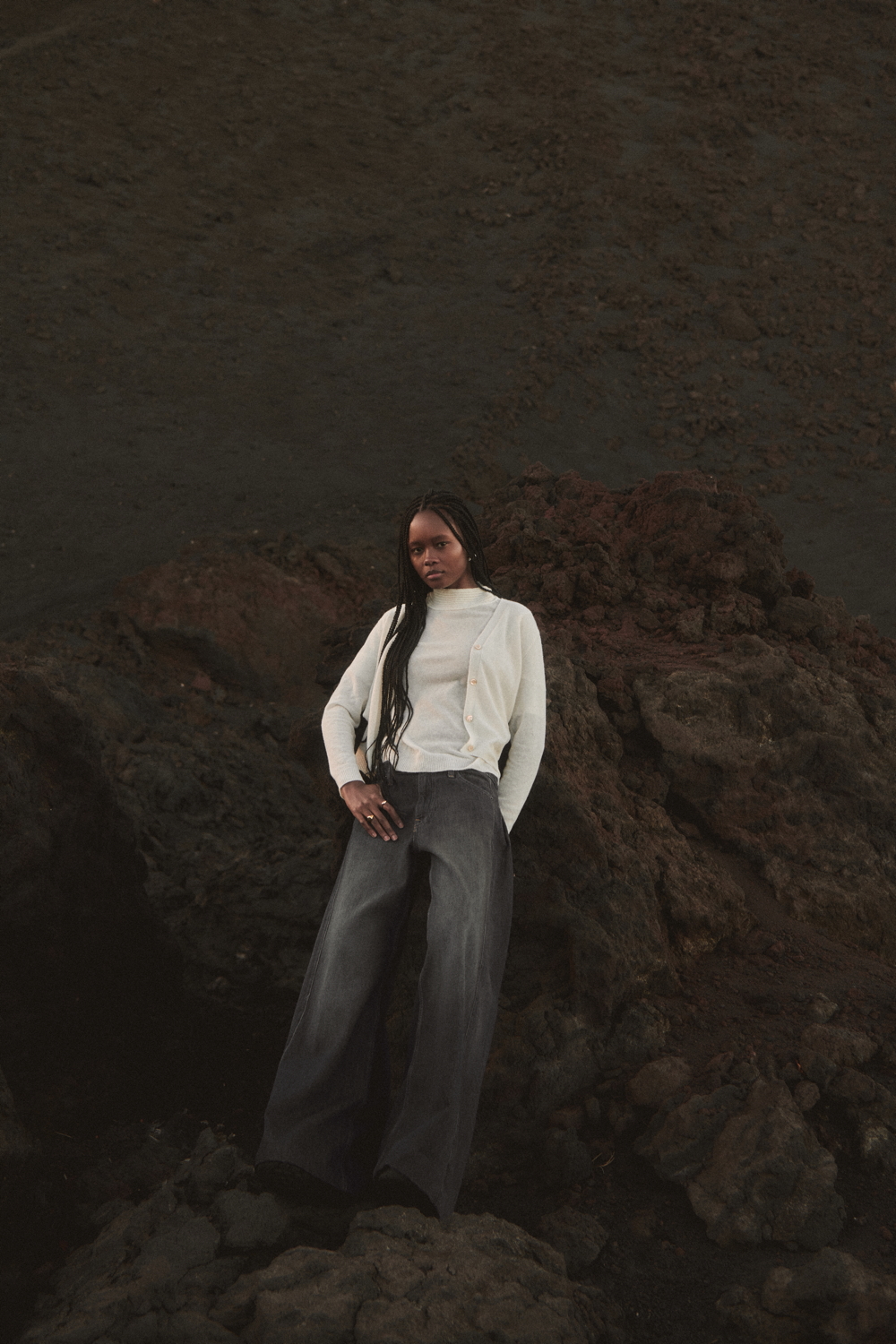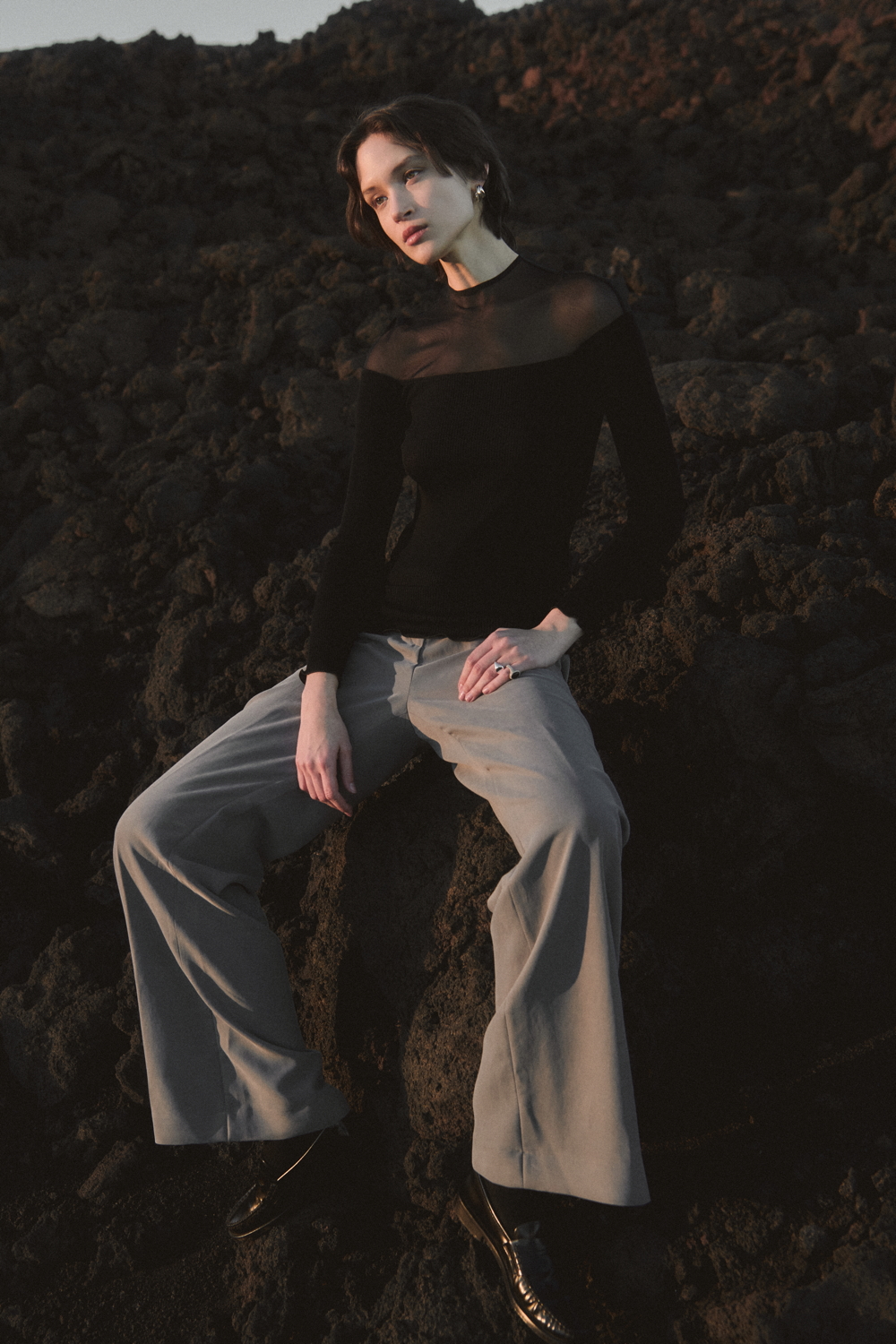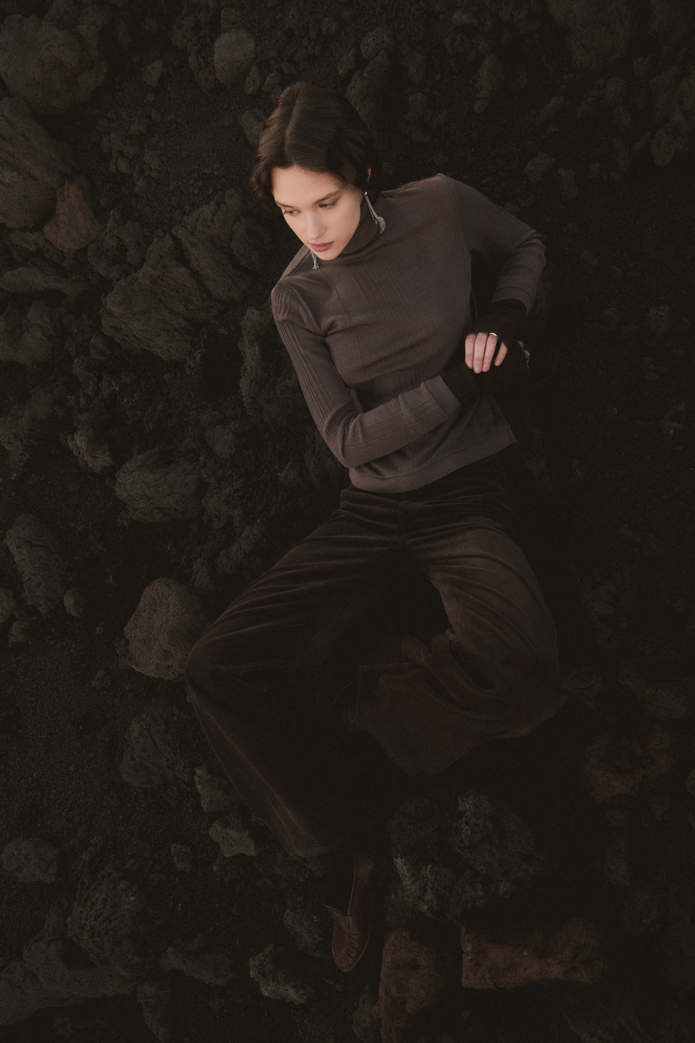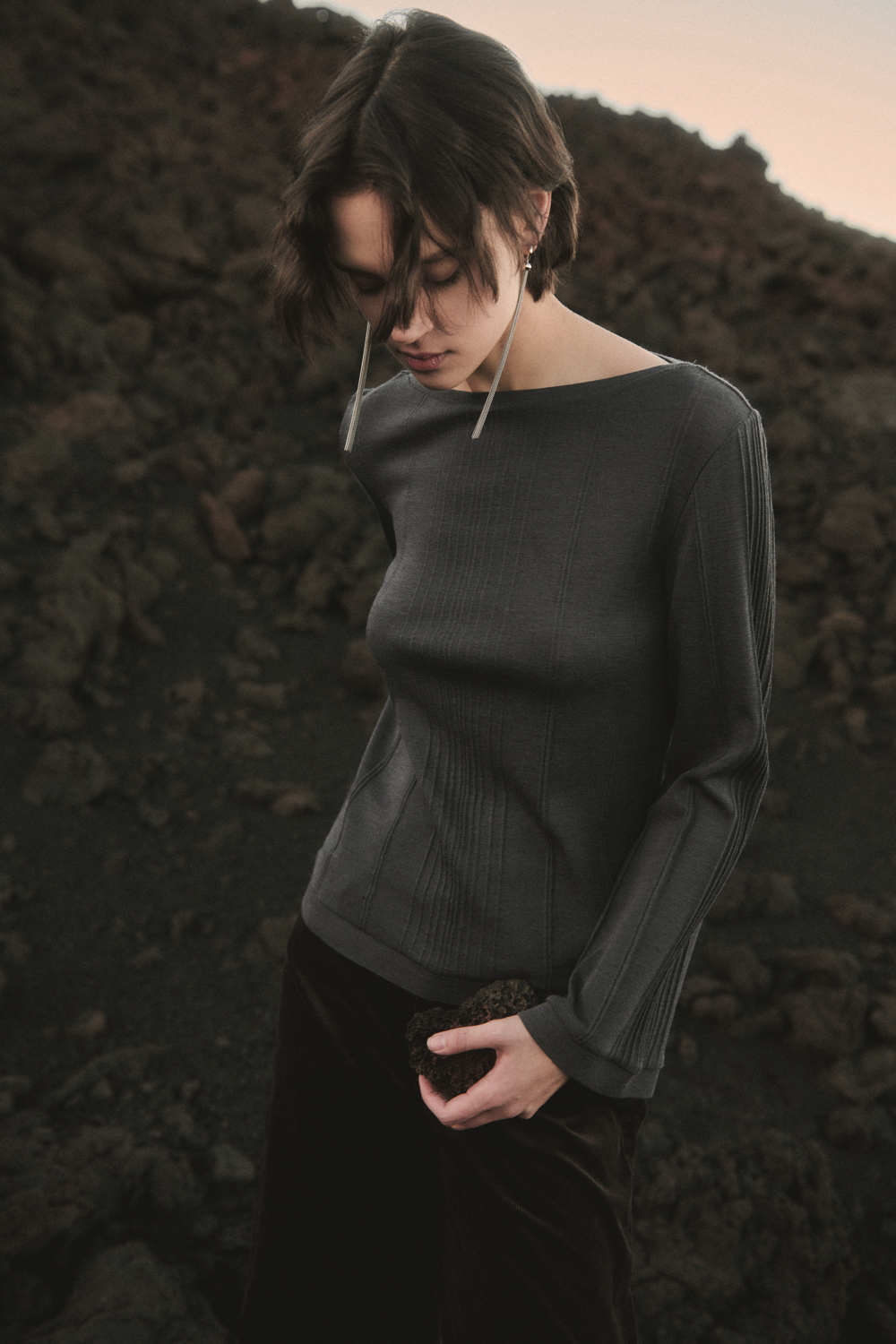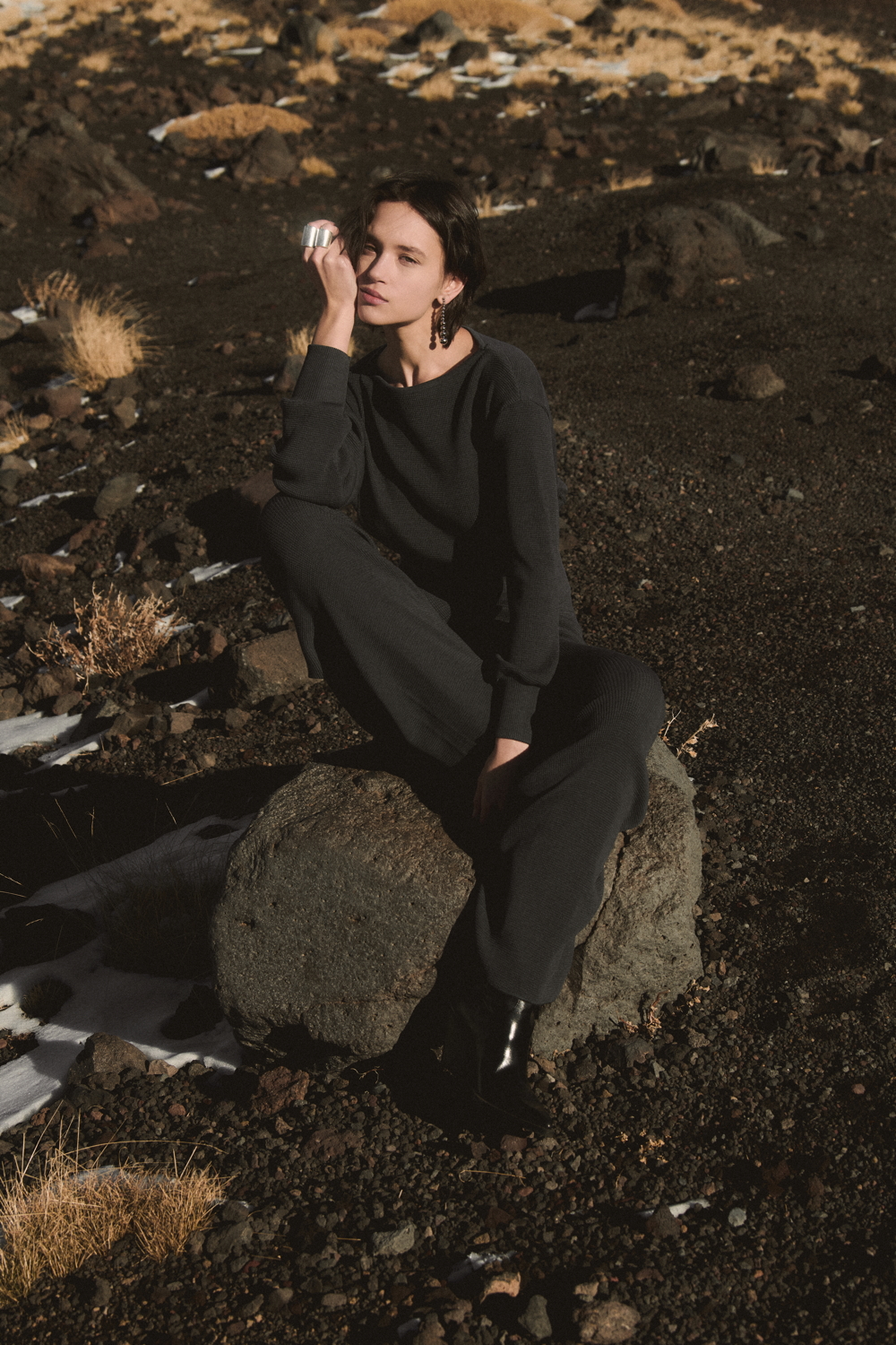 The TERRA line, an expression of Oscalito’s concrete commitment to responsible and conscious fashion, offers an essential and authentic vision of the winter wardrobe, where natural materials and clean design come together in a contemporary balance. A key highlight of the season is the wool and silk waffle fabric, with its distinctive three-dimensional texture, taken from the brand’s vintage archive and reinterpreted in modern loungewear sets composed of shirts with different necklines and wide-leg trousers. Alongside this, wool and silk fabrics with placed rib patterns enrich casual garments with a minimal character, while wool and silk flat fabric is used for knitwear with clean lines and an oversized fit.
